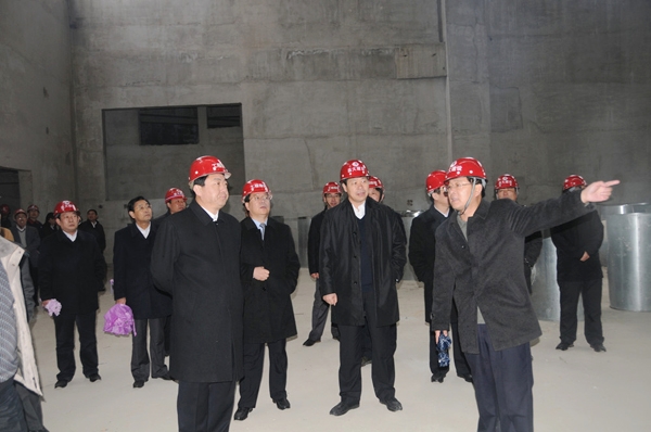 董事長(zhǎng)徐鵬強(qiáng)(前排右一)向許立全書記(前排左一)等領(lǐng)導(dǎo)介紹工程建設(shè)情況