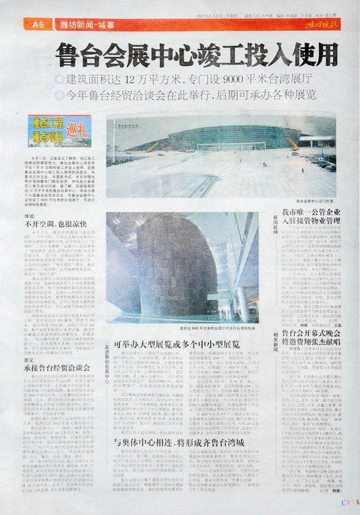 《魯臺會展中心竣工投入使用》——濰坊晚報(bào)2012年8月2日A6版