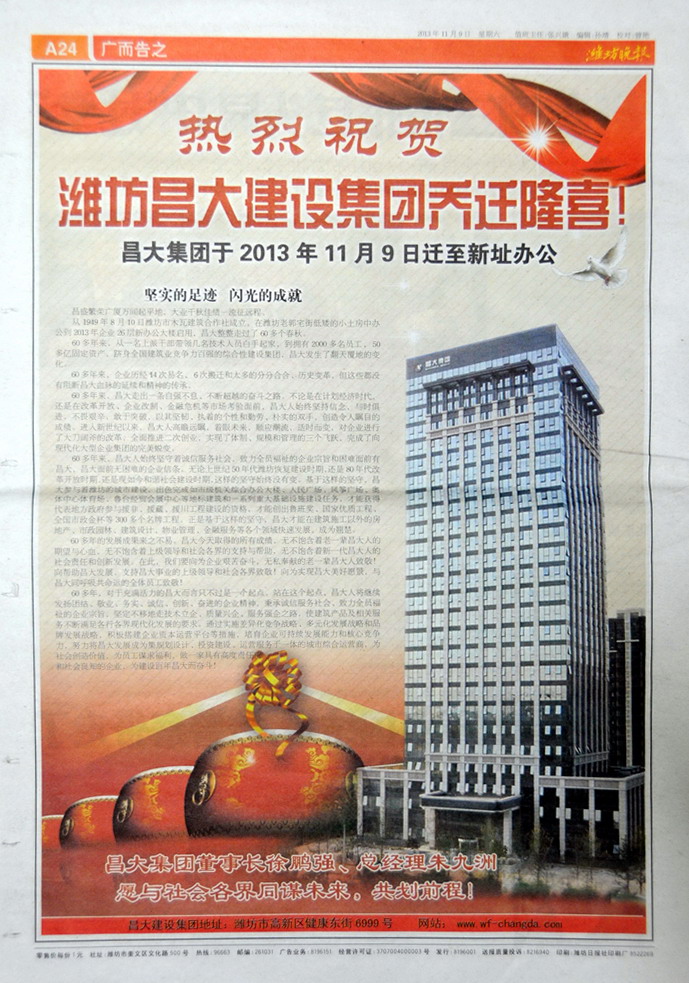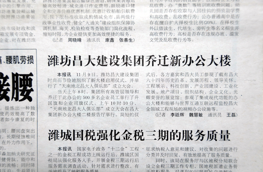 2013年11月09日,集團(tuán)喬遷至高新區(qū)健康東街6999號(hào),濰坊日?qǐng)?bào)、濰坊晚報(bào)刊登集團(tuán)喬遷慶典的報(bào)道。 ![]() ![]() ![]() ![]() ![]() 以下為《濰坊建筑》刊登昌大建設(shè)專(zhuān)業(yè)公司、專(zhuān)業(yè)人士系列報(bào)道: ![]() ![]() ![]() ![]() ![]() ![]() ![]() ![]() ![]() ![]() ![]() ![]() ![]() ![]() ![]() ![]() ![]() ![]() ![]() ![]() ![]()