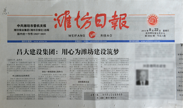 《昌大建設(shè)集團(tuán)——用心為濰坊建設(shè)筑夢》——濰坊日報(bào)2014年8月22日第二版