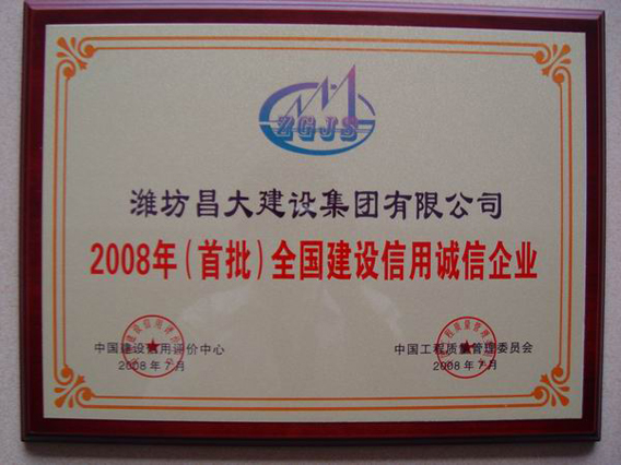 濰坊昌大建設(shè)集團被授予“2008年(首批)全國建設(shè)信用誠信企業(yè)”
