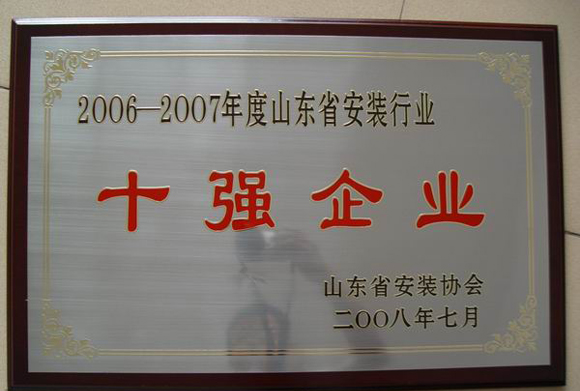 集團(tuán)公司榮獲“2006-2007年度山東省安裝行業(yè)十強(qiáng)企業(yè)”稱號 近日,山東省安裝協(xié)會發(fā)布文件,公布2006-2007年度山東省安裝行業(yè)十強(qiáng)企業(yè)和九家優(yōu)秀企業(yè)。集團(tuán)公司榮膺十強(qiáng)企業(yè)。安裝行業(yè)十強(qiáng)企業(yè)和優(yōu)秀企業(yè)的評選是根據(jù)《山東省優(yōu)秀暨十強(qiáng)安裝企業(yè)評選辦法》,經(jīng)專家評審、會長辦公會研究決定的。榮膺該項榮譽(yù)也是集團(tuán)公司總體實力的反映。(08.09.16) |
