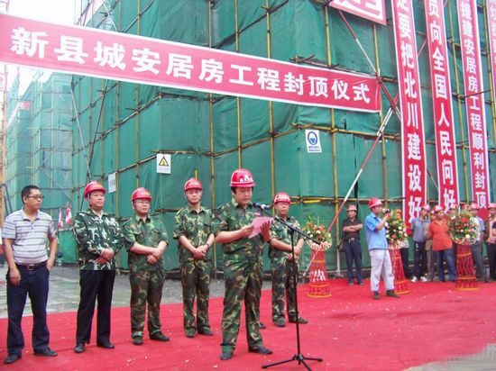 9月25日上午11時20分,山東省援建新北川安居房工程舉行隆重的封頂儀式,儀式地點就設(shè)在集團(tuán)公司承建的工程施工現(xiàn)場。中央電視臺新聞頻道在中午11時至12時的新聞直播段進(jìn)行了現(xiàn)場插播報道,“昌大建設(shè)”字號和援川人員多次在畫面中出現(xiàn)。集團(tuán)公司總經(jīng)理朱九洲參加了今天的封頂儀式并講話。今天封頂儀式現(xiàn)場下著大雨,援川人員在雨中舉行了這一慶奠。 根據(jù)指揮部的消息,第八分公司承擔(dān)的六棟安居房已于昨天(24日)全部封頂。 ![]()