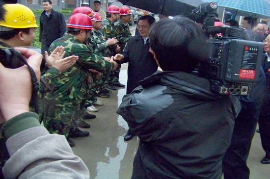 4月13日下午,春雨綿綿,中共中央政治局常委、中央紀(jì)律檢查委員會(huì)書記賀國強(qiáng)在有關(guān)人員陪同下,冒雨視察了北川新縣城援建工作。在集團(tuán)公司援建的溫泉一期安居房工程現(xiàn)場(chǎng),賀國強(qiáng)走進(jìn)住宅樓實(shí)地察看已經(jīng)建好的新居,非常高興,對(duì)山東省濰坊市援建的安居房工程給予很高的評(píng)價(jià),贊揚(yáng)山東省濰坊市的援建隊(duì)伍是一支能打硬仗的施工隊(duì)伍,他感謝在援建工作中作出辛苦努力的所有援建人員,并預(yù)祝圓滿完成援建任務(wù)。 ![]()