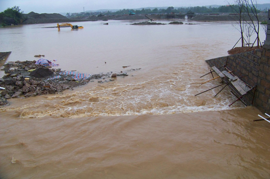 7月24日至25日,一場特大暴雨突襲北川新縣城,集團公司援建的多處工地受到影響。至25日凌晨,職工宿舍、辦公室、食堂等地方進(jìn)水高達(dá)40cm,集團公司的援川人員,特別是第八分公司的員工及時展開自救。幾個小時內(nèi),大家先后將室內(nèi)的物品轉(zhuǎn)移到高處沒有進(jìn)水的房間,天一亮,指揮部便緊急組織工地?fù)岆U,大家分工協(xié)同,分別趕赴安昌河下游施工段和安昌河已驗收河段查看受災(zāi)情況……由于指揮部早在20日就下達(dá)安昌河防防汛通知,各施工單位提前應(yīng)對,從而保證在這次特大洪水來臨時,所有施工人員安全撤離、所有材料轉(zhuǎn)移(由于汛情超過預(yù)想,第八分公司安昌河下游施工段景觀濕地形成了大面積積水致使一些土方機械過水)。此次洪水來襲,已竣工的安昌河段安然無恙,第八分公司正在施工的安昌河下游溢流堰、擋水堰已經(jīng)合攏,經(jīng)受住了洪水沖擊。 ![]() 洪水中的施工現(xiàn)場