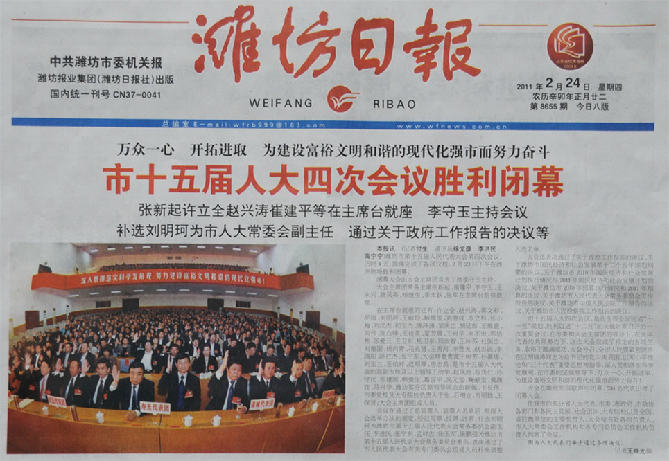 濰坊市第十五屆人民代表大會(huì)第四次會(huì)議于2011年2月23日勝利閉幕。會(huì)議補(bǔ)選集團(tuán)公司董事長、黨委書記徐鵬強(qiáng)同志為濰坊市第十五屆人民代表大會(huì)常務(wù)委員會(huì)委員。