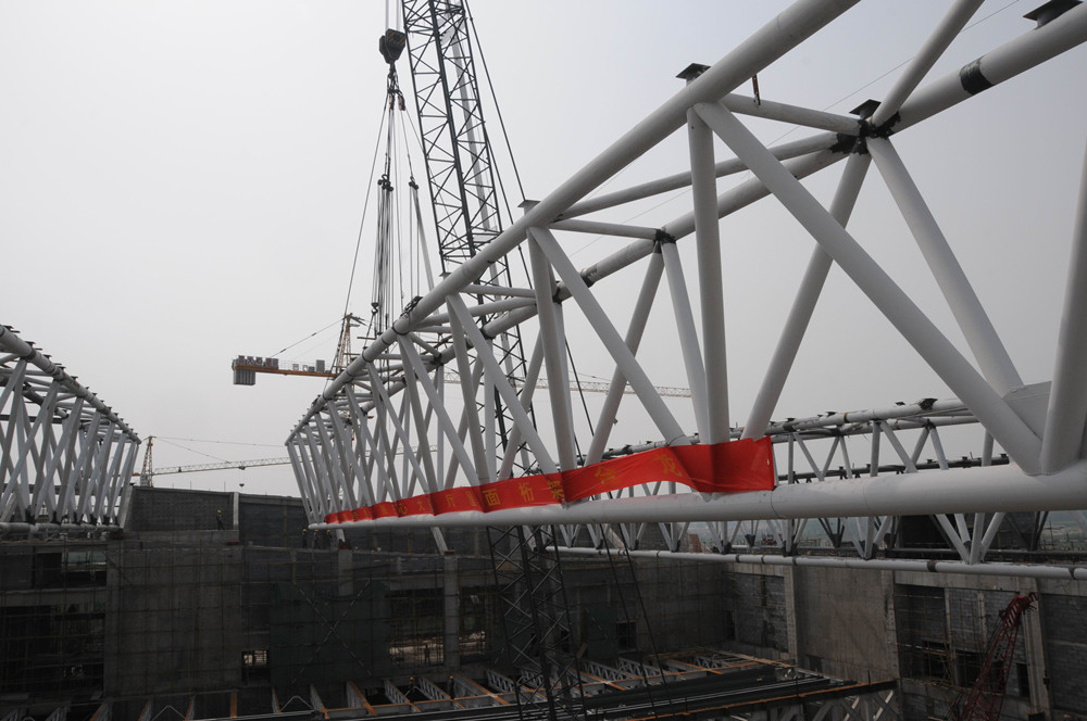當(dāng)天下午2點(diǎn)38分,會展中心工程現(xiàn)場鞭炮齊鳴,伴隨著320噸大吊車的一陣轟鳴,最后一榀97噸重的鋼構(gòu)桁架徐徐升起、吊裝就位、校正扶位。集團(tuán)公司總經(jīng)理、會展中心工程總指揮朱九洲,會展中心工程現(xiàn)場總指揮孫孔喜,集團(tuán)公司副總工程師、會展中心質(zhì)量技術(shù)組組長王維奇及集團(tuán)公司會展中心指揮部成員、參建單位項(xiàng)目經(jīng)理參加了吊裝儀式。