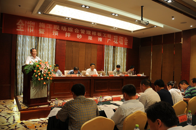 按照程序安排,上午的現(xiàn)場會共分兩部分舉行,首先進(jìn)行的是參觀金融廣場施工現(xiàn)場,觀摩預(yù)攪拌砂漿現(xiàn)場操作演示情況,隨后在金茂國際大酒店舉行施工現(xiàn)場管理經(jīng)驗介紹和預(yù)攪拌砂漿推介會議。集團(tuán)公司總工程師張連悅向與會人員介紹了集團(tuán)公司近年來推行施工現(xiàn)場管理工作的情況。