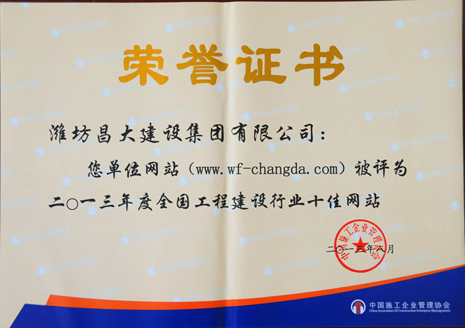 2013年8月15日至17日,中國施工企業(yè)管理協(xié)會召開年度通聯(lián)員工作會議,報告通聯(lián)年度工作,開展聯(lián)絡員通訊員交流活動,表彰優(yōu)秀報刊、網(wǎng)站,表彰優(yōu)秀聯(lián)絡員、通訊員。集團公司官方網(wǎng)站(nxky.com.cn)被評為2013年度全國工程建設行業(yè)十佳網(wǎng)站。《昌大建設報》被評為全國工程建設行業(yè)銀頁報紙獎。