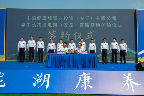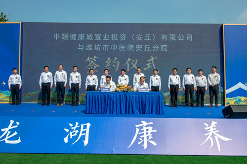 上午10:18,活動正式開始。李新閣同志代表安丘市委、市政府致辭,徐鵬強同志代表中頤健康城置業(yè)投資有限公司股東致辭。10:28,周波同志代表中頤龍湖康養(yǎng)小鎮(zhèn)與入駐小鎮(zhèn)的濰坊市中醫(yī)院安丘分院、安丘市老年大學市北區(qū)分校、中頤跨境電商(安丘)直播基地、濰坊干細胞再生醫(yī)學中心等四家合作單位的代表簽約。11:38,李新閣書記和徐鵬強董事長執(zhí)起紅綢為山東中頤明天養(yǎng)老服務有限公司正式揭牌。11:48,隨著主席臺領導和嘉賓同時啟動燈光柱,中頤龍湖康養(yǎng)小鎮(zhèn)頤樂康養(yǎng)中心正式啟幕運行。