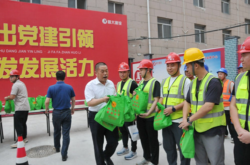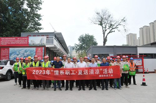 2023年7月12日上午,濰坊市總工會(huì)副主席朱建平到集團(tuán)總承包施工的市重點(diǎn)項(xiàng)目濰坊市人民醫(yī)院項(xiàng)目現(xiàn)場(chǎng)進(jìn)行了“情系職工?夏送清涼”走訪慰問(wèn)活動(dòng),向廣大一線建設(shè)者表示慰問(wèn),并為一建公司、四建公司一線職工發(fā)放清涼物資包(天堂折疊傘、日照綠茶、六神花露水、奇強(qiáng)洗衣粉、舒蕾沐浴露、潔玉毛巾等)。
