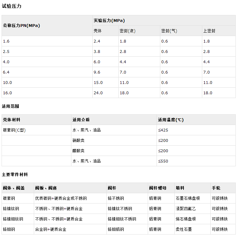 結(jié)構(gòu)型式:彈性楔式單閘板、剛性楔式單閘板和雙閘板型式。 廣泛適用于石油化工,火力發(fā)電廠等油品、水蒸汽管路上作接通或截斷管路中介質(zhì)的啟閉裝置。 主要性能規(guī)范